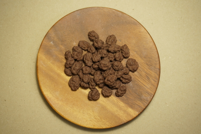 甘いぶどうの香りが漂ってきました。そして、袋を開けてびっくりしたことがありました。レーズンにチョコレートをかけたお菓子といえば丸くて表面はツルッとしているイメージですが、無印良品のワイン漬けレーズンチョコは凸凹しています。おそらく、貴腐ワインの原料である貴腐化したぶどうをイメージしてでこぼことした形になったのでしょう。ちょっと不気味な形です・・・。