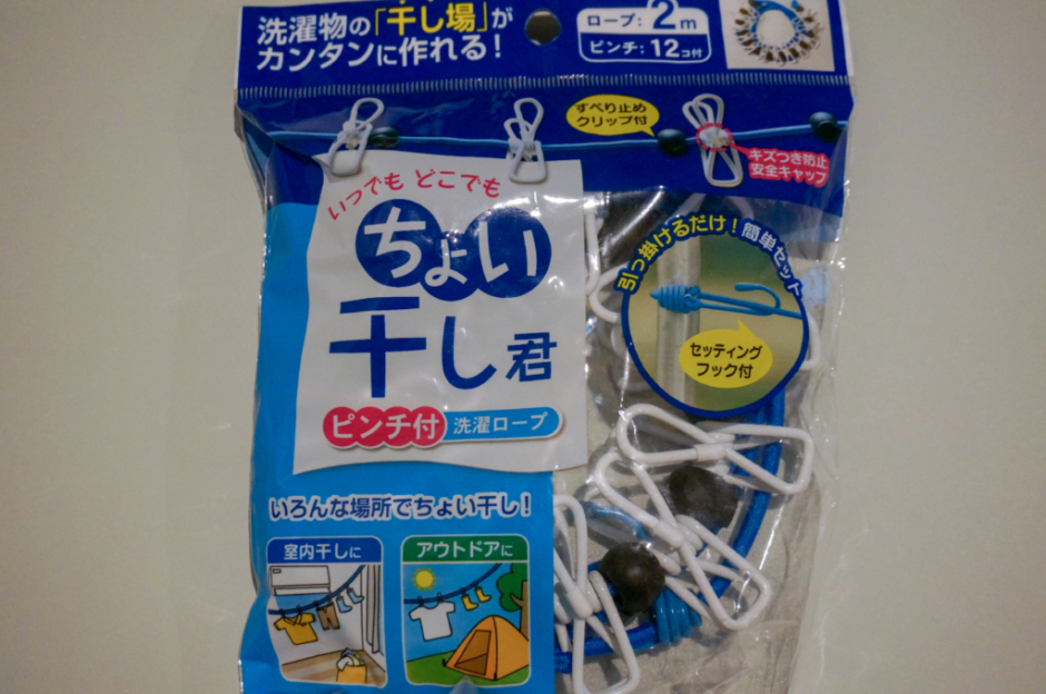 この記事ではforallのちょい干し君をご紹介します。ちょい干し君は長さ2mの洗濯ロープです。ゴム紐の端についているフックで上手に引っ掛けることさえできれば、いつでもどこでも洗濯物の干し場を用意することができます。ピンチ(=洗濯バサミ)が12個ついていて洗濯物を固定できる他、各ピンチとピンチの間には滑り止めのクリップがついているので洗濯物の間隔を調整することができます。まっすぐ張れたほうが良いのはもちろんですが、斜めに張っても洗濯物と洗濯物の間に隙間ができるので最小限の時間で乾燥させることができます。安価でコンパクトながらもかゆいところに手が届くアイデア商品です。