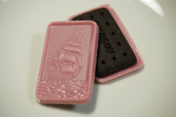 ほろ苦いココアビスケットを香ばしくさっくりと焼き上げ、帆船を形どった甘酸っぱいいちごチョコと組み合わせたオリジナルなチョコレートビスケットです。