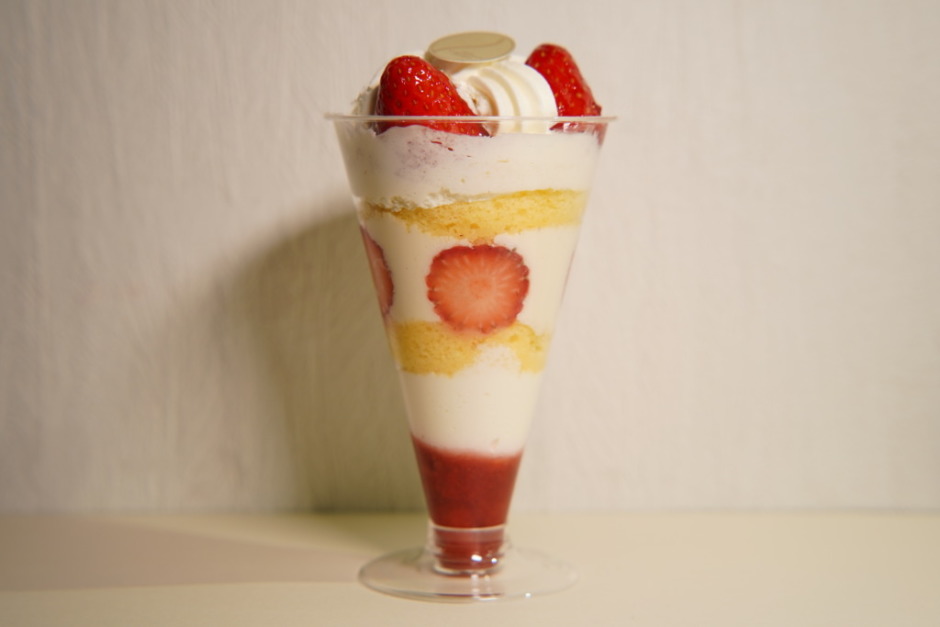 ショートケーキのパルフェです。ショートケーキは期間限定商品が人気なのはもちろんのことですが、期間限定商品にも匹敵する人気を誇る定番商品です。通年安定した人気の美味しいパルフェです。