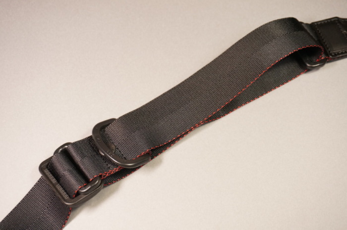 ストラップの中間付近にはイージースライダー機構があります。リングを持って引っ張ると片手でも簡単にストラップの長さ調整を行うことができます。通常ストラップは長さを固定して使うものですが、撮影時と移動時など状況によって長めが良かったり短めが良かったりと使い勝手の良い長さは変わります。そんなときにちょっと引っ張るだけで簡単に長さの調節ができるので、一度このイージースライダー機構を使ってしまうと固定のストラップは使えなくなってしまうほど便利です。