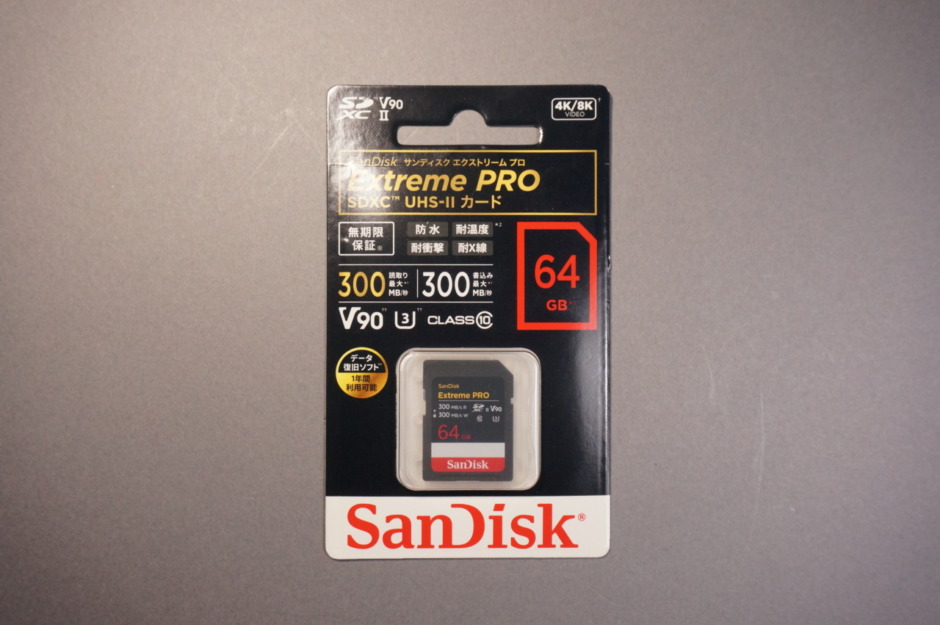 この記事ではSanDisk Extreme Pro SDXC UHS-Ⅱカード 64GB(SDSDXDM-064G-GHJIN)をご紹介します。UHS-Ⅱ規格対応のSDカードの中で、高速かつ互換性に定評があるのはサンディスク製の商品とソニー製の商品がありますが、今回はその中でもサンディスク製のものを選びました。元々、同規格のサンディスク製SDカードを使用していたので全く新しいものとしてではなく買い増しです。