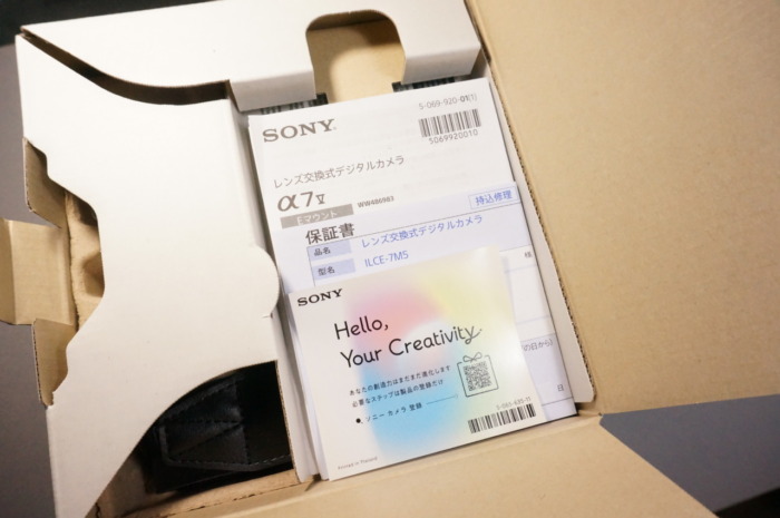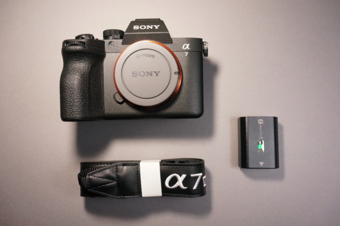 内容物は本体、ストラップ、バッテリー(NP-FZ100)、保証書類です。充電器や充電ケーブルは従来のものがそのまま流用できるので省略されています。昔はおまけで色々付いていたのですが、今となっては最低限で小さくするというのが当たり前になりました。今回初めてa7シリーズを入手する方の場合は、本体と同時に充電器も入手するくらいでもちょうどよいかもしれません。
