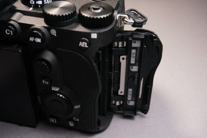 CF Experess Type Aカードを使用する場合はSLOT 1に手前が端子のない表面になるように差し込みます。SDカードを使用する場合は、手前が端子のある裏面になるように差し込みます。SLOT1もSLOT2もSDカードはUHS-Ⅰ/ UHS-Ⅱ対応SDカードを使用することができます。上位機種では両スロットともCF Experess Type Aに対応していたので、ここは差別化されているポイントとなっています。