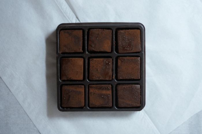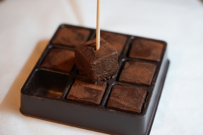 内容量は9個入りです。個別に仕切りが付いているので横のチョコレート同士がくっついて離れなくなってしまうということはありません。楊枝のような細いものを差し込むとスッと持ち上がります。