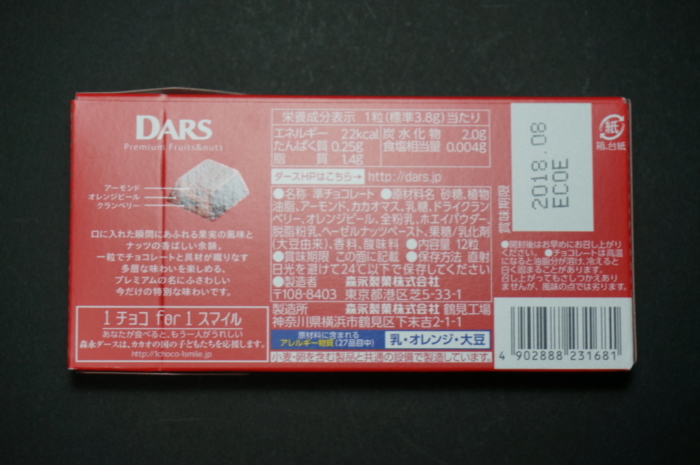 パッケージはマットレッドで、オレンジとクランベリーとアーモンドが箔押しで描かれています。華やかに香るカカオと口どけガナッシュと同様に高級感を感じるパッケージでした。価格は通常のDARSの2倍ですが、内容量は安心の12粒です。(内容量減らしはされてません!!←嬉しい)