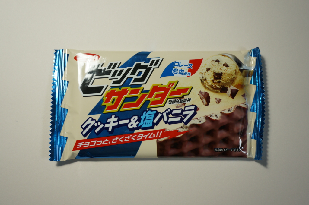 この記事では有楽製菓のビッグサンダーのクッキー&塩バニラ味をご紹介します。クッキー&塩バニラ味はビッグサンダー限定の味です。塩顔と書かれているのですが、外側からの見た目はビッグサンダーと比べると濃い目です。