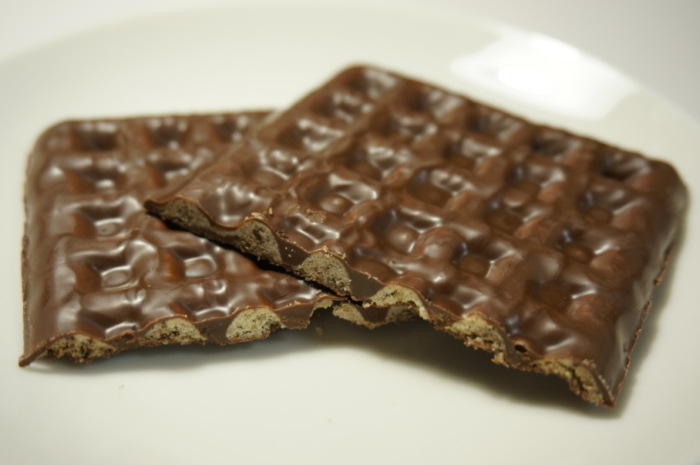 ブラックサンダーの約4倍のサイズで、ビッグサンダーとは同じサイズです。ビッグサンダーのほうが表面がなめらかでしたが、こちらは凸凹が目立ちます。決してチョコレートの層が薄いというわけではなさそうなので、あえてチョコレートに「むら」をつけていると考えられます。また、ビッグサンダーよりもチョコレートの色が濃い目です。