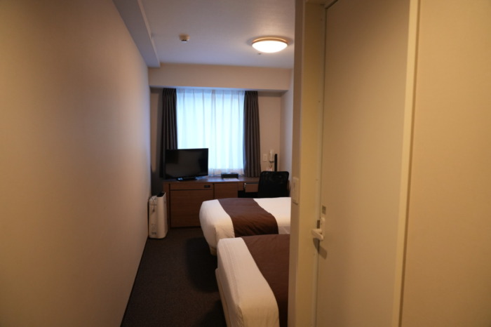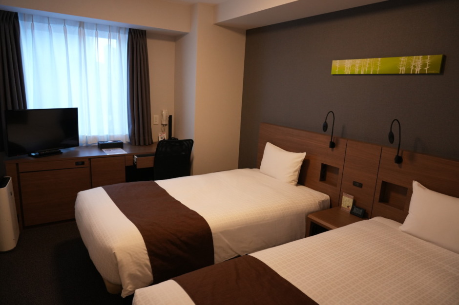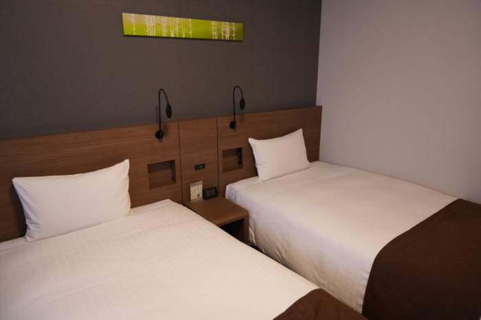 前に宿泊した際にはセミダブルベッドの部屋でしたが、今回は連泊なのでツインの部屋を選びました。ツインとセミダブルでは部屋のサイズは変わらないようですが、連泊の場合は気持ち広めに使えるツインのほうが快適かなと思います。