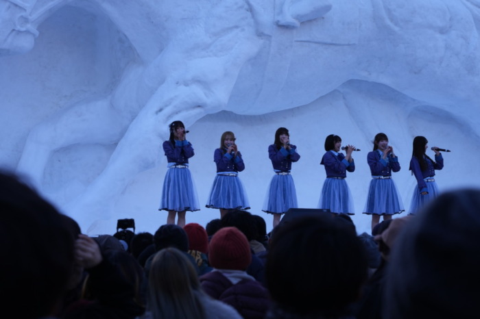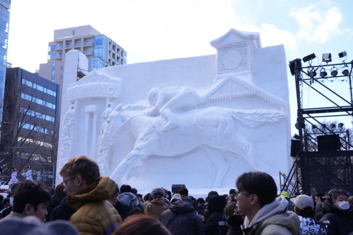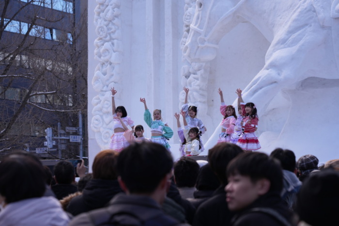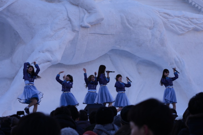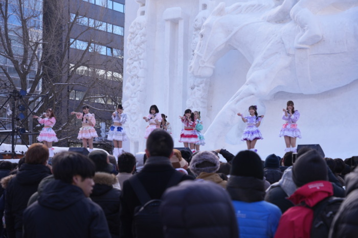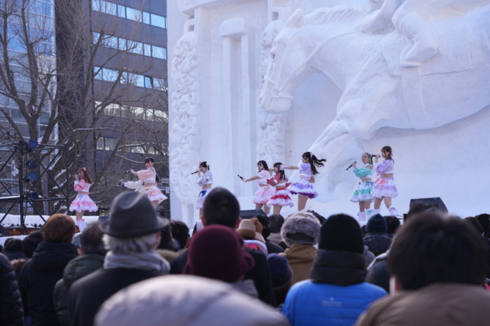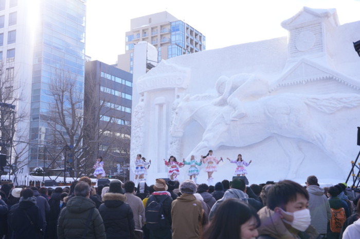 5丁目の大雪像は『札幌へ駆けるサラブレッド』でした。大雪像がステージとして使われていて、ちょうどご当地アイドルのライブが開かれていました。それなりに知名度があるのか多くのファンが集まっているようでした。