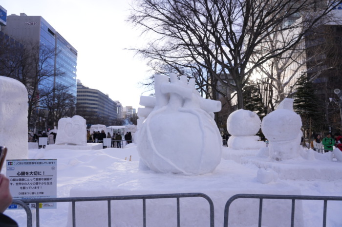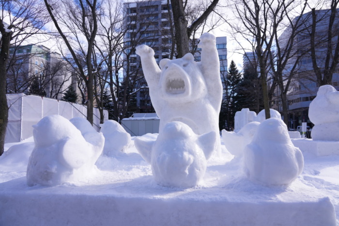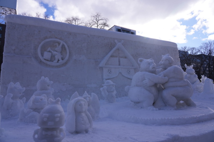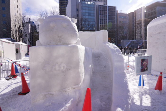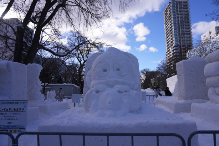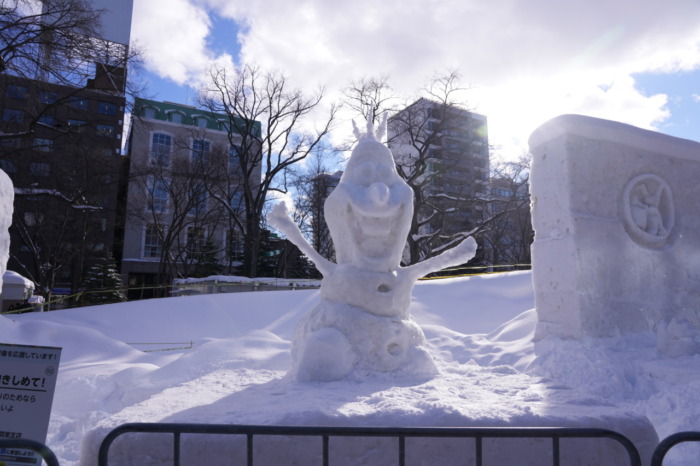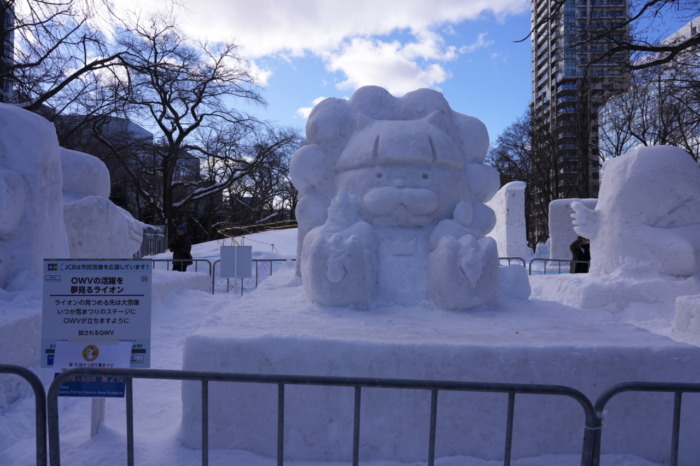 雪まつりの会場を一通り回ってきました。今年の雪まつりを端的に表すと『青空が見えていて気温もそれほど寒くない』でした。足元も雪が溶けてぬかるんでいるというとても春のような気候の中でのイベントでした。雪像にとってはとても過酷な環境だったのは、途中に溶けた跡がある雪像が何体もあったことから間違いありません。実際のところ見て回る分には寒くないほうが良いのですが、雪が減って溶けてしまうというのはもしかすると今後の開催時には課題になってくるのかもしれません。