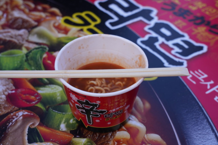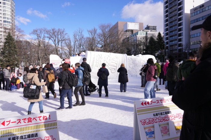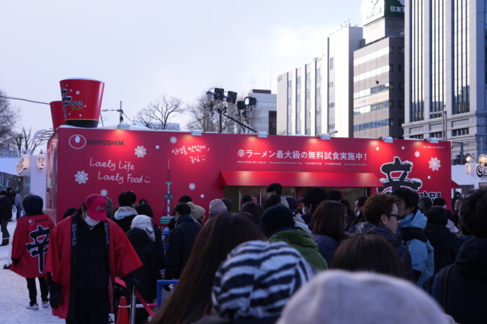 辛ラーメンのサンプリングもありました。辛ラーメンは韓国の農心が展開しているインスタントラーメンです。韓国の公園で周りの人が辛ラーメンを食べていたのを思い出しました。冬の大通公園で温かいラーメンをサンプリングするというのは企画勝ちです。辛いのですが、少しでも温まることができました。