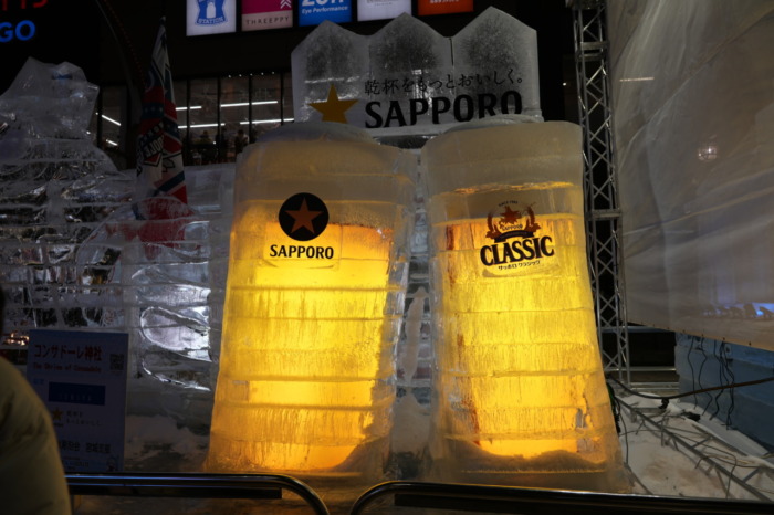 札幌市時計台から続いてスポンサー氷像が並んでいます。札幌といえばサッポロビールです。代表的な商品の『サッポロ生ビール黒ラベル』と北海道限定の『サッポロクラッシック』の氷像がありました。