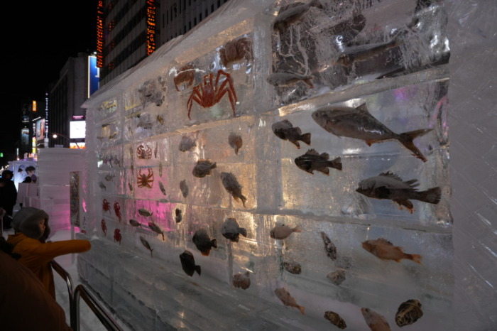 すしざんまいのお魚氷像です。カニも入っていますが赤くなっているので茹でられた後のようでした。