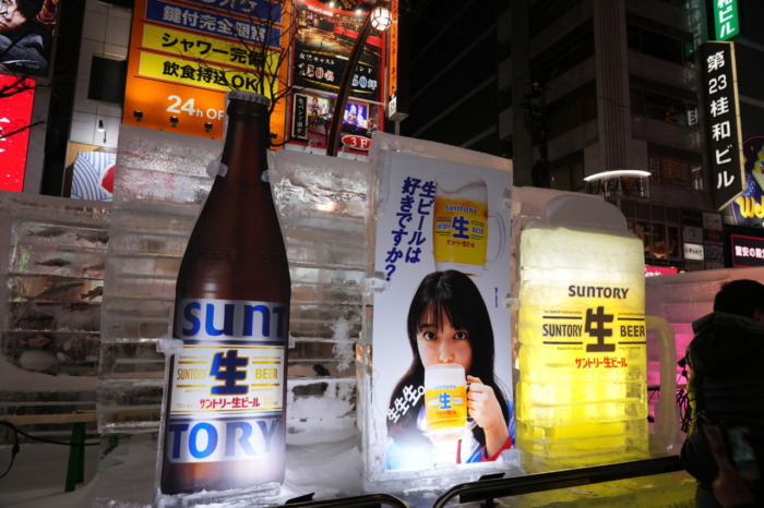 北海道に工場があるサッポロ、アサヒ、キリンとは違って工場は無いサントリーの氷像もありました。