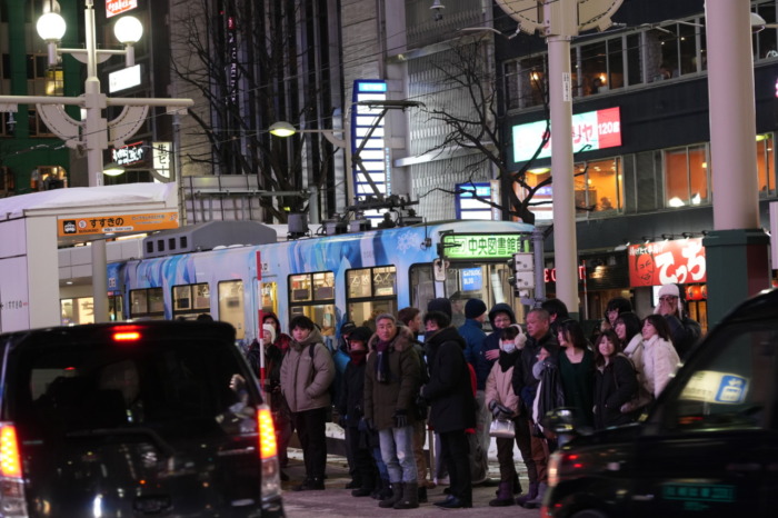 すすきの交差点で信号待ちしていたらちょうど雪ミクラッピングの札幌市電も通過していきました。